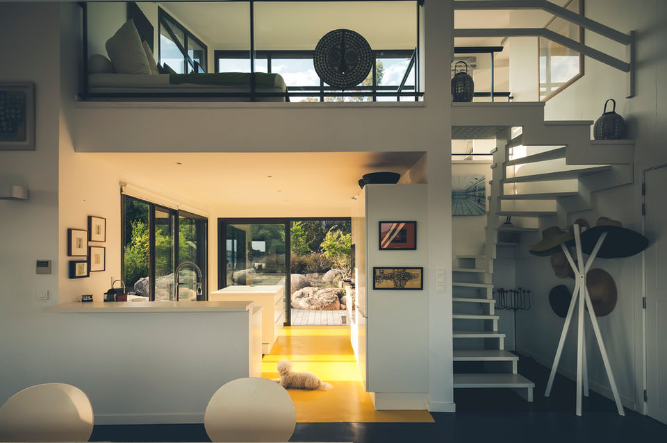 Le béton lazuré en noir et la toiture sombre se fondent dans les teintes foncées du maquis.