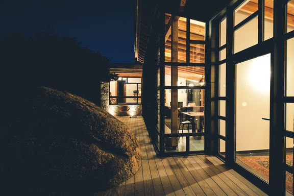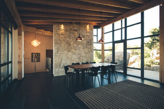 Tel un musée à ciel ouvert, le terrain offrait de superbes rochers, magnifiquement sculptés. Composée entre et autour de ces éléments forts, la villa est comme encastrée, laissant apparaître « un toit sur les rochers ». Ce toit en ardoise est simple pour s’effacer au maximum et donner à la nature un rôle essentiel.